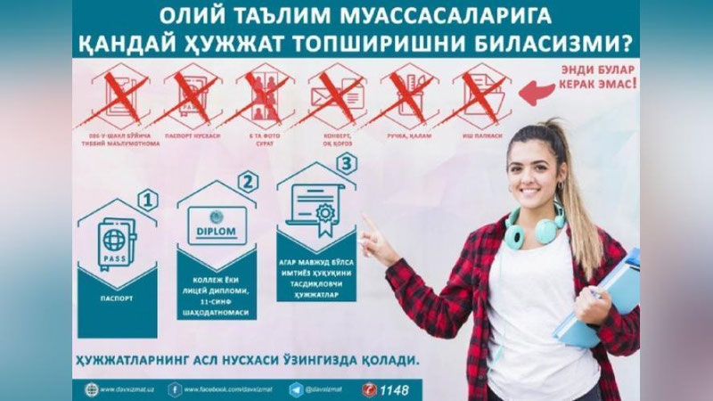 Davlat xizmatlari markazlari tomonidan hujjatlar 15 iyundan 15 iyulgacha abiturientlarning doimiy ro`yxatda turgan joyidan qat`i nazar qabul qilinadi.