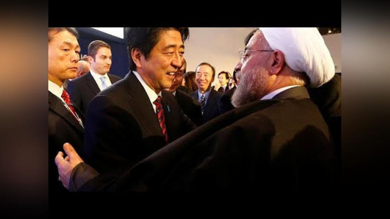 Bu yil Tehron va Tokio o`rtasida diplomatik munosabatlar o`rnatilganligiga90 yil to`ldi. Mazkur safar shu munosabat bilan tashkil etildi. Safar davomida Yaponiya bosh vaziri Eron islom respublikasi rahbari Hasan Ruhoniy va mamlakat diniy rahnamosi Oyatullo Humayniy bilan uchrashdi. Uchrashuvda Bosh vazir Yaqin Sharq mintaqasida tinchlik va barqarorlikni o`rnatishga yordam berish uning asosiy maqsadi ekanini ta`kidladi va bu masaladi Yaponiya bor imkoniyatini kuchga solishini ma`lum qildi. Yaqin Sharq mintaqasidagi barqarorlik kun chiqar yurt uchun juda muhim sanaladi. Zero energetika masalasida Yaponiya ushbu hududga qaramdir.