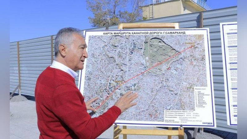 Fotosuratda taqdim etilgan ma`lumotlarga ko`ra, osma yo`l uzunligi 5,5 kilometrdan ziyodroqni tashkil etib, u biri Samarqand markazida joylashgan uchta stansiyani o`z ichiga oladi.