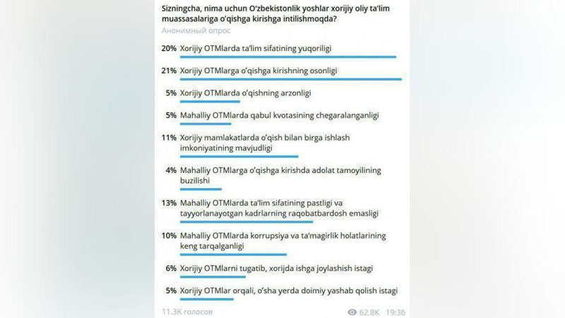 O`zbekiston yoshlar ittifoqi 27 senyatbr — 5 oktyabr kunlari “Fikringizcha, nima uchun o`zbekistonliklar xorijiy OTMlarga o`qishga kirishga intilmoqda?” degan so`rovnoma o`tkazgan edi. Tashkilot so`rovnomaga qatnashgan barcha ishtirokchilarga minnatdorchilik bildirgan holda natijalarni e`lon qildi. Fikrlar esa foiz ko`rsatkichiga ko`ra qo`yidagicha: