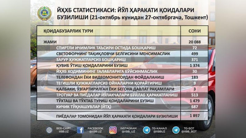 Toshkent shahar IIBB Matbuot xizmati ma`lumotlariga ko`ra, Toshkent shahrida so`nggi 1 haftada sodir etilgan YTHlar ro`yxati elon qilindi. Unga ko`ra, joriy yilning 21-27 oktyabr kunlarida jami 20088 ta YTH sodir etilgan bo`lib, eng ko`pi piyodalar tomonidan sodir etilgan qoidabuzarliklar - 1897 ta va eng kami qalbaki davlat raqamli avtoulovlarni boshqarish holatlari - 3 tani tashkil etgan.