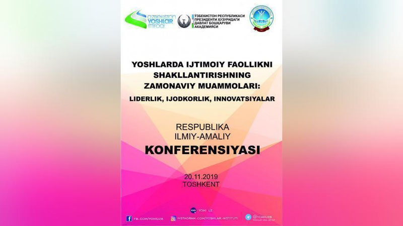 Mazkur konferensiya joriy yilning 20 noyabr kuni O`zbekiston yoshlar ittifoqi, O`zbekiston Respublikasi Prezidenti huzuridagi Davlat boshqaruvi akademiyasi, O`zbekiston yoshlar ittifoqi hamda O`zbekiston Respublikasi Prezidenti huzuridagi Davlat boshqaruvi akademiyasi qoshidagi Yoshlar muammolarini o`rganish va istiqbolli kadrlarni tayyorlash instituti tomonidan O`zbekiston Respublikasi Prezidenti huzuridagi Davlat boshqaruvi akademiyasida 3 ta sho``ba asosida tashkil etiladi.