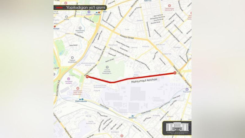С 21:00 26 августа до 07:00 27 августа на части улицы Махтумкули — от улицы Мирзо Улугбека до улицы Паркентской (трёхуровневая развязка) — будут проходить ремонтные работы.