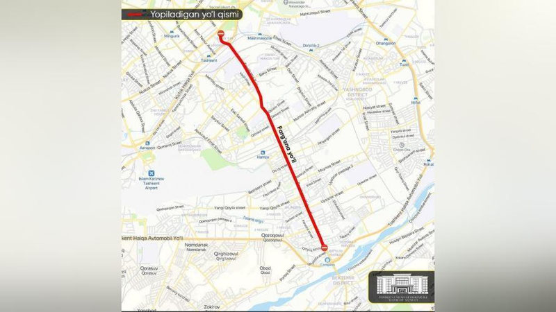 29 августа с 06:00 до 18:00 часть улицы Фаргона йули – в отрезке между улицами Нукусской и Куйлик ота – будет перекрыта для автомобильного движения из-за работ по ремонту.