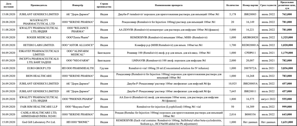 Всего за 9 месяцев 2020 года препарата Ремдесивир ввезено в республику 11 импортёрами, в количестве 56 109 упаковок, на общую сумму более 2 млн долл. США.
