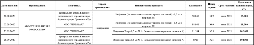 Минимальная розничная стоимость данной вакцины от гриппа должна быть не более 69 000 сумов, максимальная – 102 000 сумов. Средняя розничная стоимость – 86 000 сумов.