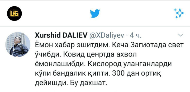 «Большинство из тех, кто был подключен к кислороду, умерли. Сообщается о более чем 300. Это страшно», - говорилось в сообщении журналиста Хуршида Далиева в Twitter.