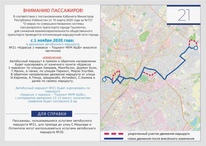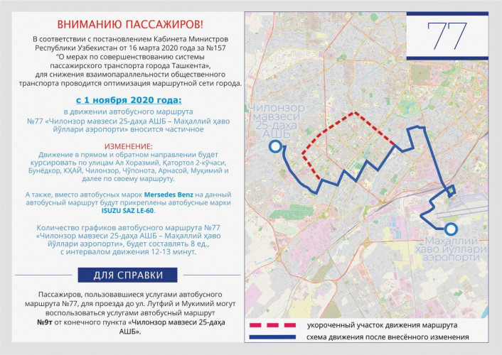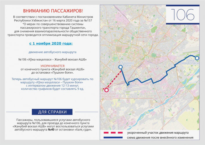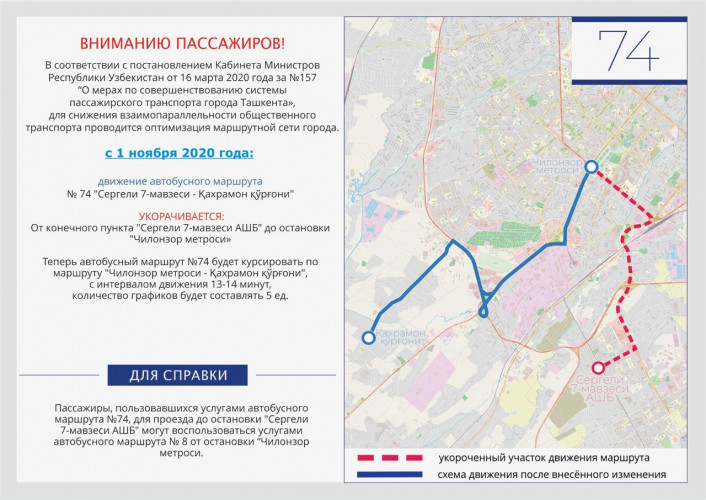 Управление транспорта по городу Ташкенту вслед за ранее заявленной очередной оптимизации с 1 ноября автобусных маршрутов, сочло необходимым произвести небольшую корректировку в урезаемых маршрутах.