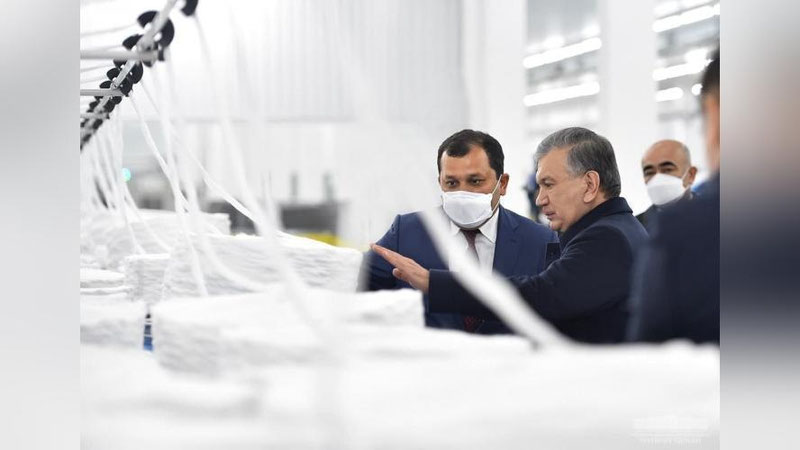 Свою поездку в регион глава государства начал с ознакомления с производством пряжи и тканей из синтетических волокон в обществе с ограниченной ответственностью Oqsaroy Vortex в городе Шахрисабзе.