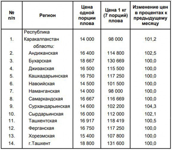 Оценка составлена по результатам выборочных наблюдений комитета на предприятиях общественного питания (Центрах плова) центральных регионов страны. Самую дорогую порцию плова подают в Ташкенте – 18.800 сумов. При этом с октября эта цена не изменилась. Дешевле всего купить плов можно в Намангане и Нукусе – 14 000 сумов.