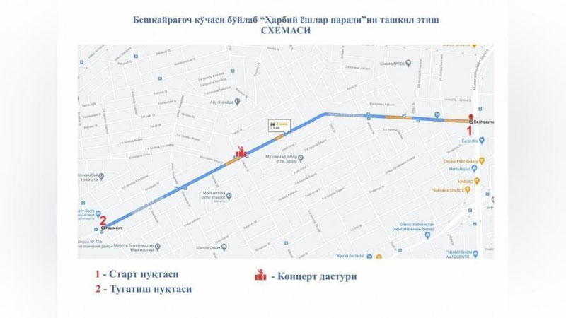 В связи с этим с 14:00 до 16:00 участок от перекрестка улиц Бешкайрогоч и Малой кольцевой дороги до перекрестка улиц Бешкайрогоч и Ибрат будет временно закрыт в связи с проведением «Военного парада молодежи» в рамках «Месяца молодежи».