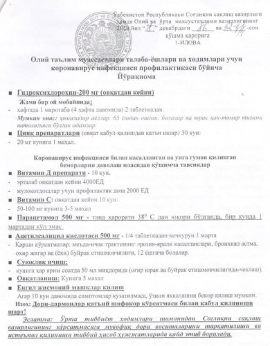 В документе отмечается необходимость приема препаратов "гидроксихлорохин" и "цинк" студентами и сотрудниками вуза для профилактики, а при обнаружении или подозрении на коронавирус лечиться дополнительными лекарствами и следовать рекомендациям.