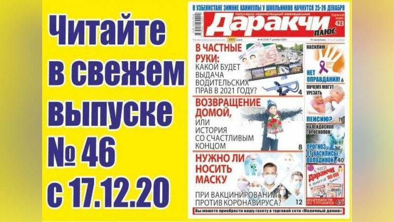 Приобрести новый номер газеты можно в киосках "Матбуот таркатувчи" и торговой сети "Молочный домик".