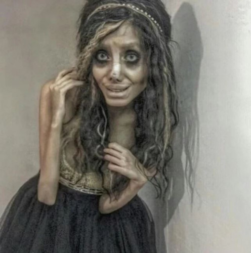 Снимки 19-летней девушка были оценены судом как фото с "устрашающе изможденным лицом". За необычную внешность ее также прозвали "Зомби-двойником актрисы Анджелины Джоли", на которую она и стремилась стать похожей.