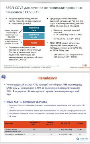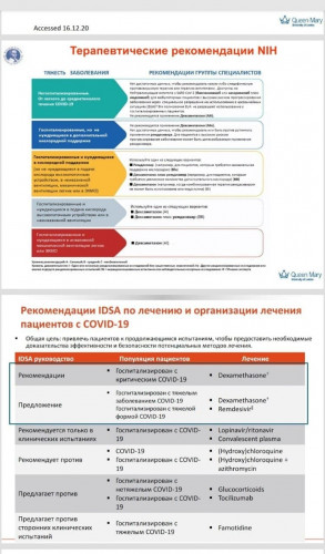 В частности, отмечено, что при негоспитализированных легкой и среднетяжелой формах течения Covid-19 не рекомендуется применение дексаметозона. Также он не рекомендуется при госпитализированной, но не нуждающейся в кислородной поддержке, форме течения болезни. При последней также нет достаточных данных, чтобы рекомендовать или быть против рутинного применения ремдесивира. Однако он может быть полезен для пациентов с высоким риском прогрессирования заболевания.