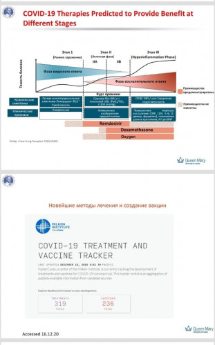 Доктор А. Гупта представил последние данные, основанным на обмене международным опытом, по основным симптомам заболевания, внелёгочным проявлениям Covid-19, характерным особенностям различных форм протекания болезни, принятым в разных странах алгоритмам ведения больных и, соответственно этому, применением лекарственных препаратов. Специалисты во всём мире считают необходимым избегать полипрагмазии, то есть применения большого количества лекарственных средств, что способно ухудшить процесс выздоровления.