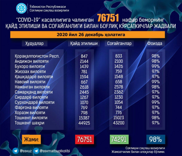 По итогам 26 декабря 2020 года количество официально зарегистрированных случаев коронавирусной инфекции в Узбекистане составляет 76 751, сообщает пресс-служба Минздрава.