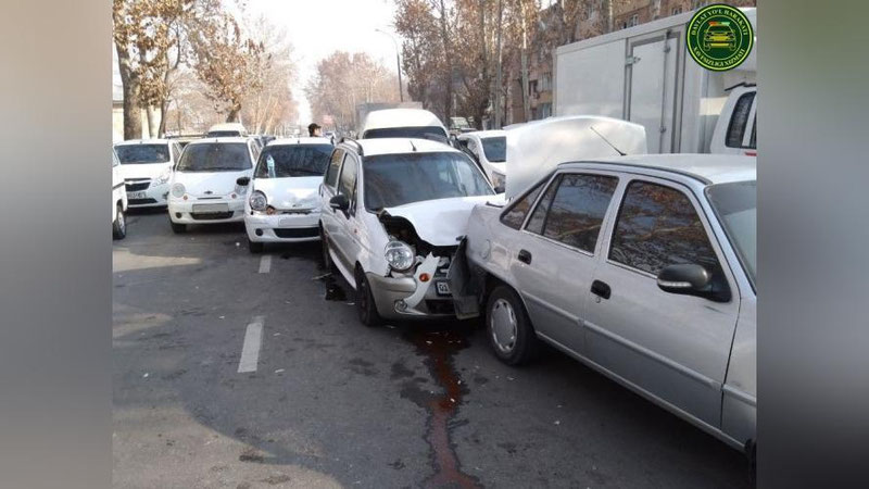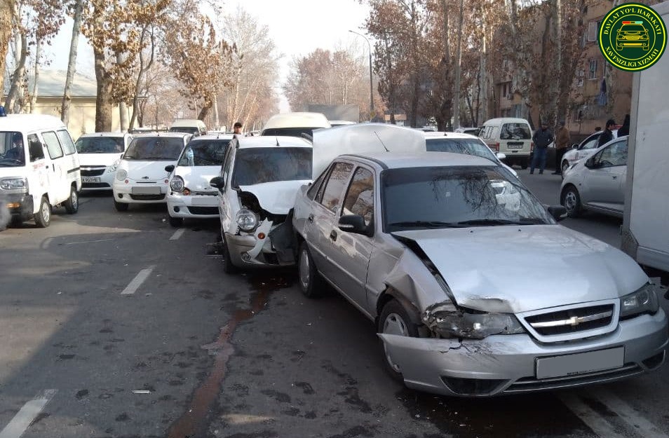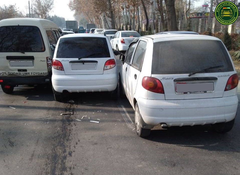 В результате несоблюдения дистанции при управлении "Матизом", водитель, 1999 г.р., врезался в остановившийся на красный свет у парка Богишамол автомобиль "Дамас". В свою очередь от удара "Дамас" двинулся и врезался в стоящий впереди "Матиз", а тот - в еще один "Матиз", который в свою очередь врезался в "Нексию".