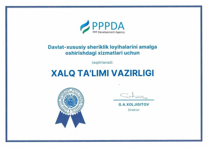 В сфере народного образования в прошлом году были подписаны договоры государственно-частного партнерства на сумму более 92 млрд сумов. На сегодняшний день из 50 проектов, включенных в реестр проектов государственно-частного партнерства, 24 или около 48% — это проекты в сфере народного образования.