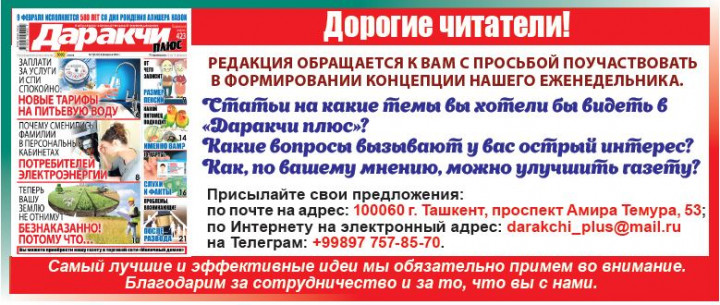 Приобрести новый номер газеты можно в киосках "Матбуот таркатувчи" и торговой сети "Молочный домик".