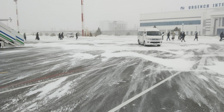 На международный аэропорт Ургенча обрушились снегопад и шквалистый ветер. Здесь температура упала до минус 9. Полосы пришлось чистить от снега: