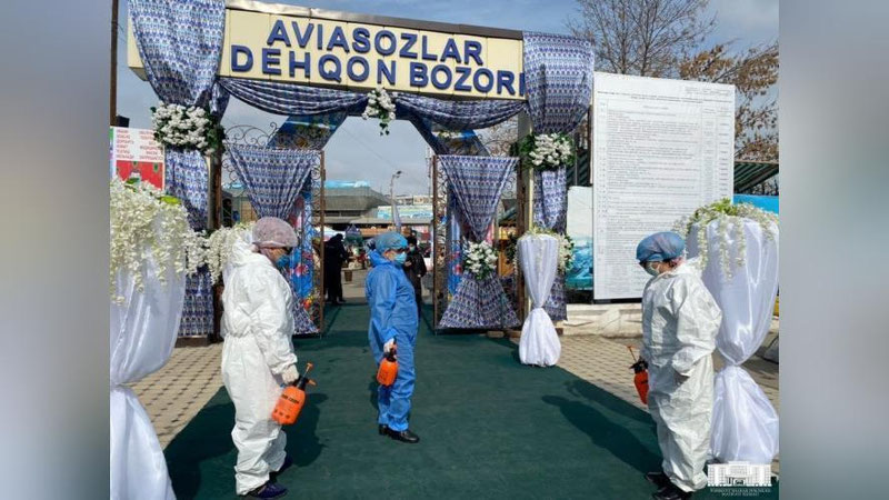 В частности, на всех рынках и в торговых центрах столицы, администрация определенного рынка, Государственная инспекция санитарно-эпидемиологического надзора, Национальная гвардия Узбекистана и МВД совместно у входов контролируют наличие медицинских масок. Также температуру входящих на территорию постоянно измеряют инфракрасными термометрами (тепловизорами), а их руки дезинфицируют антисептиками.
