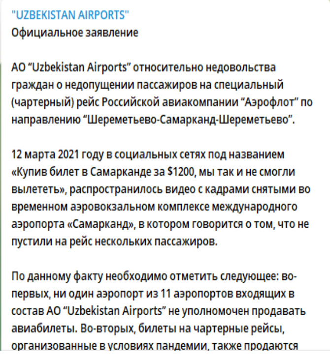 Узбекистан приостановил пассажирское сообщение из-за распространения коронавирусной инфекции ещё в марте прошлого года. В марте этого года некоторые направления были открыты. В Россию пока разрешено вылетать только спецрейсами.