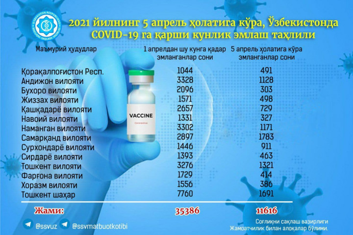 За 4 дня с начала вакцинации были привиты более 35 тысяч человек – пожилых людей и медицинских работников. Больше всего вакцинированных в Ташкенте - 7760. За минувшие сутки по стране были вакцинированы 11 616 человек.