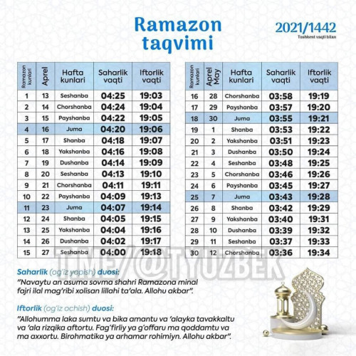 По информации Управления мусульман Узбекистана, дата начала священного месяца Рамазан в 2021 году совпадает с 13 апреля.