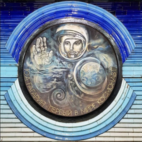 А здесь Гагарин изображен на барельефе интерьера одной из самых красивых станций метро в Ташкенте - метро "Космонавтов".