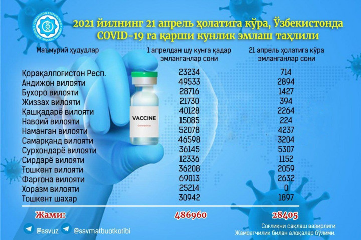 Отметим, что на сегодняшний день вакцинировано свыше 486 тысяч человек. Высокие темпы вакцинации зафиксированы в Ферганской и Наманганской областях.