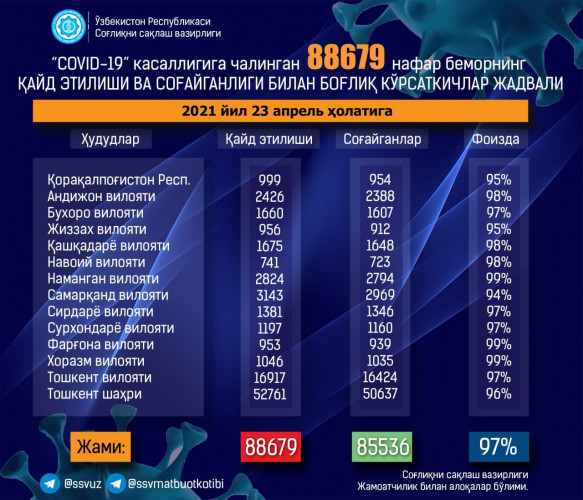 По итогам 23 апреля 2021 года количество официально зарегистрированных случаев коронавирусной инфекции в Узбекистане составляет 88679 , сообщает пресс-служба Минздрава.
