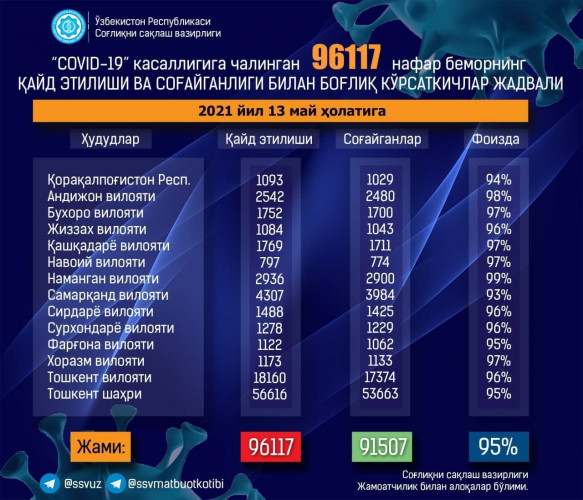 По итогам 13 мая 2021 года количество официально зарегистрированных случаев коронавирусной инфекции в Узбекистане составляет 96117, сообщает пресс-служба Минздрава.