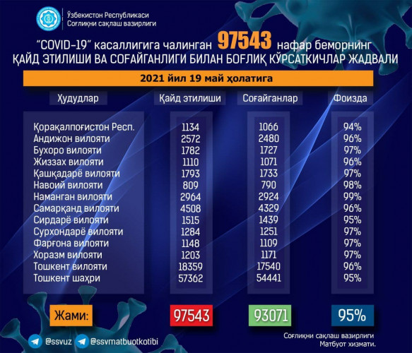 По итогам 19 мая 2021 года количество официально зарегистрированных случаев коронавирусной инфекции в Узбекистане составляет 97543, сообщает пресс-служба Минздрава.