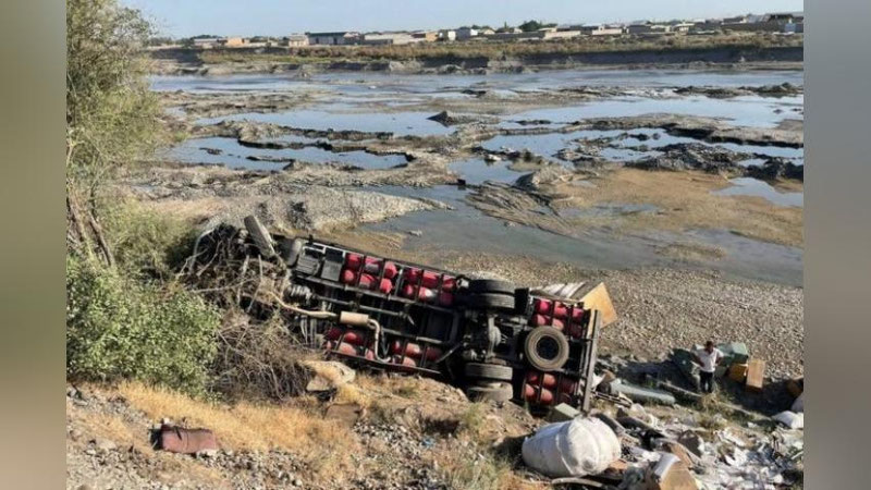 Грузовой автомобиль съехал с дороги и опрокинулся и на берегу реки Зарафшан. В результате инцидента, по счастливой случайности, никто не пострадал.
