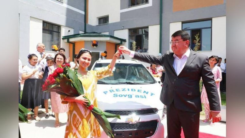 Хоким Сурхандарьинской области Тура Боболов передал Президентский подарок – легковой автомобиль «Спарк» ученице 10-го класса Рухшоне Абдураззаковой.