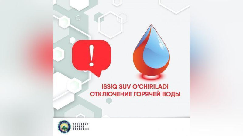 5 июня c 07:00 до 21:00 будет временно прекращено горячее водоснабжение по ряду адресов Юнусабадского, Алмазарского, Шайхантахурского и Мирзо-Улугбекского районов.