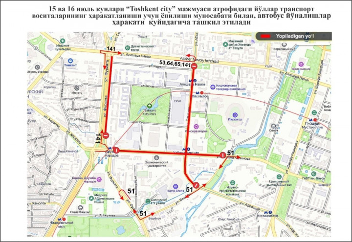 В связи с этим вокруг Tashkent City будут закрыты следующие участки дорог: