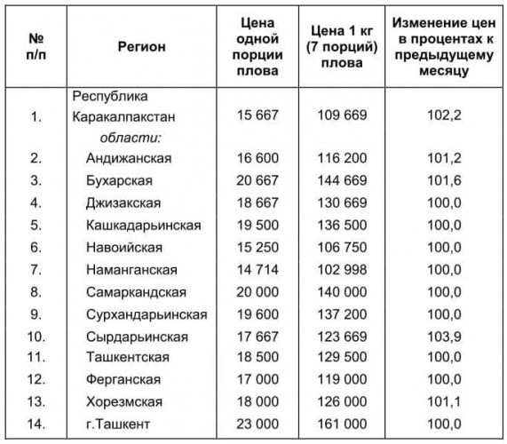 Самую дорогую порцию плова по традиции подают в Ташкенте – 23.000 сумов. При этом с июня эта цена не изменилась. Дешевле всего купить плов можно в Намангане – 14 714 сумов.