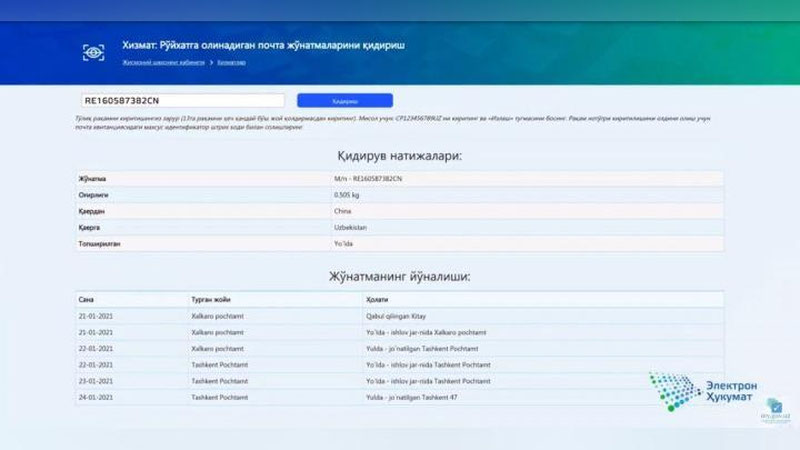 Чтобы воспользоваться данной услугой, необходимо зайти на ЕПИГУ -my.gov.uz. «Для того чтобы выполнить операцию, необходимо в соответствующем разделе ввести специальный номер и задать поиск», - говорится в сообщении. В автоматическом режиме на экране будет предоставлена оперативная информация о состоянии почтовой рассылки.