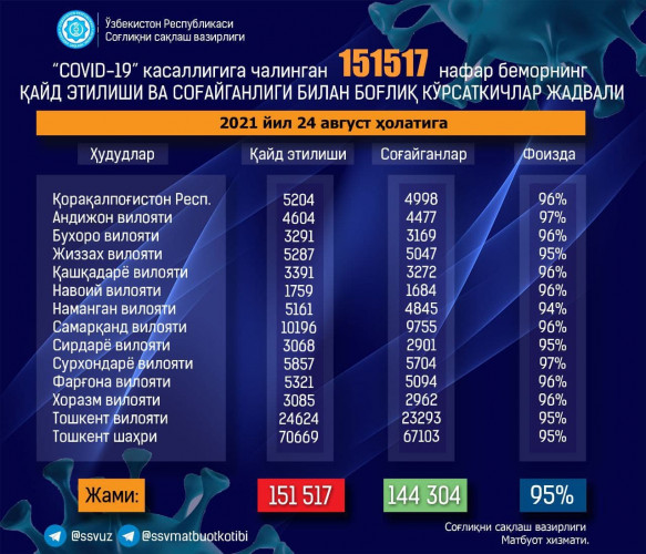 По итогам 24 августа 2021 года количество официально зарегистрированных случаев коронавирусной инфекции в Узбекистане составляет 151517, сообщает пресс-служба Минздрава.