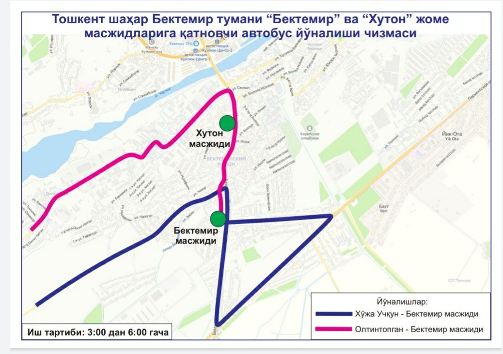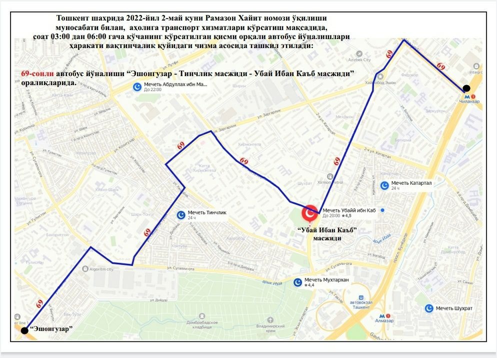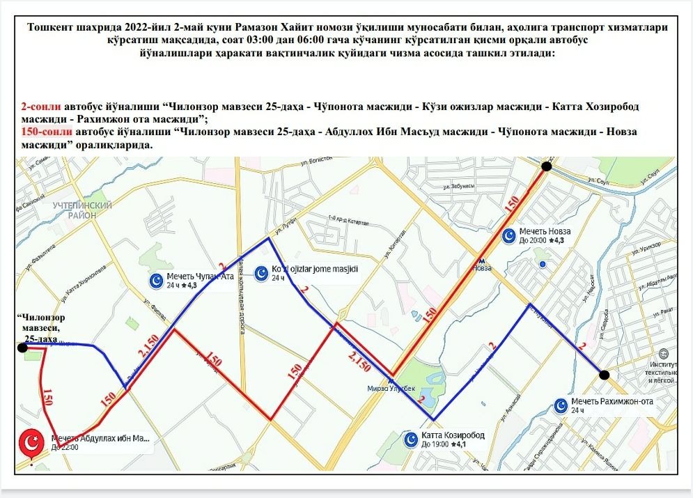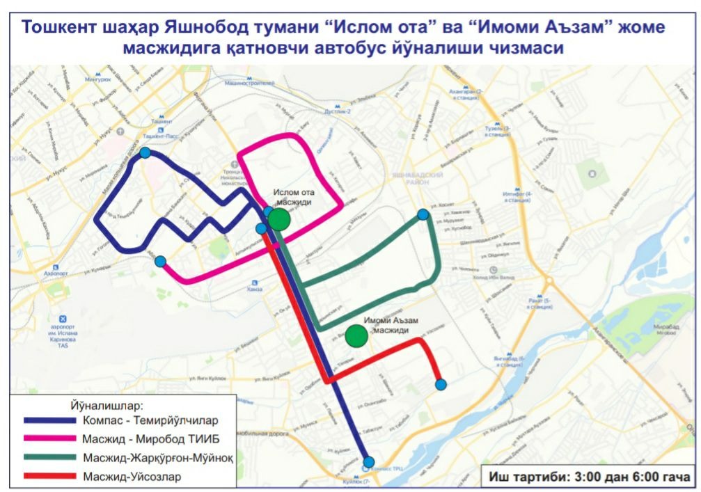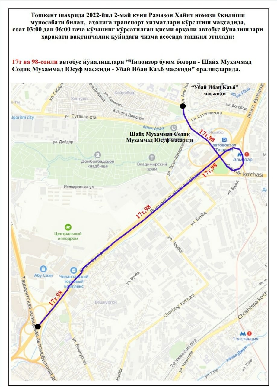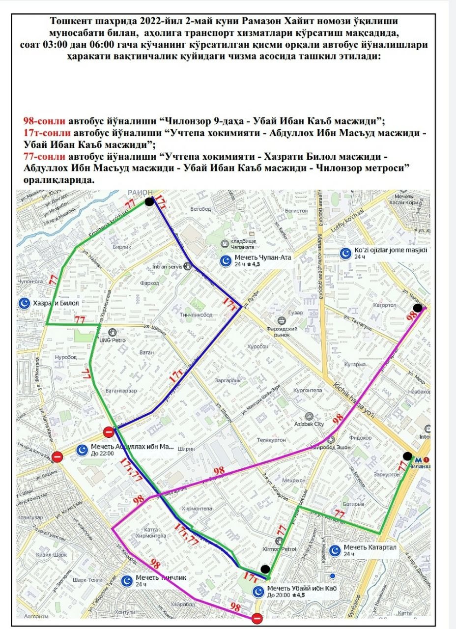 В целях создания удобства для наших граждан при посещении этих мечетей, недопущения пробок на дорогах и обеспечения качественных, безопасных услуг общественного транспорта с 03:00 до 06:00 будут функционировать следующие автобусные маршруты:
