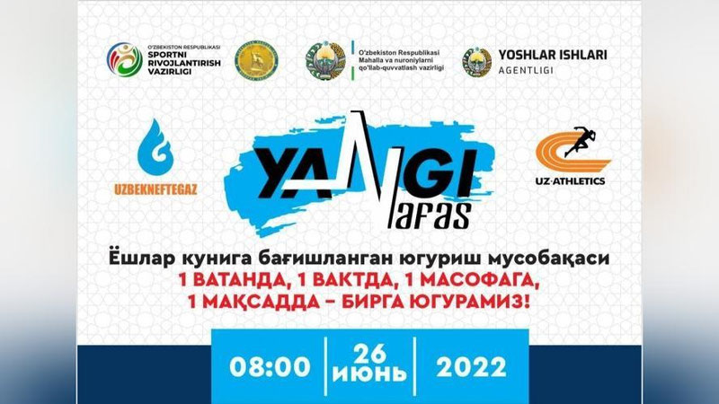 Под слоганом «1 страна, 1 старт, 1 дистанция, 1 цель – Бежим вместе» 26 июня 2022 года состоится спортивный забег «Янги Нафас» («Новое Дыхание»), приуроченный ко Дню молодёжи.
