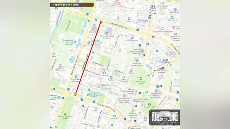 В связи с этим с 19:00 часов 27 июня до 00:00 часов 29 июня для движения автомобильного транспорта перекрыт проспект Буюк Турон — от пересечения с проспектом Ислама Каримова до пересечения с проспектом Алишера Навои.