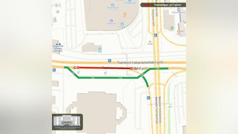В связи с дорожно-строительными работами часть ТКАД напротив продуктового рынка «Куйлюк» по направлению Сергели-Рохат в Ташкенте будет закрыта для движения транспорта.