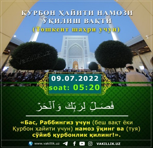 По ее данным, в мечетях Ташкента 9 июля в 05:20 утра состоится намаз по случаю праздника Курбан хайит.
