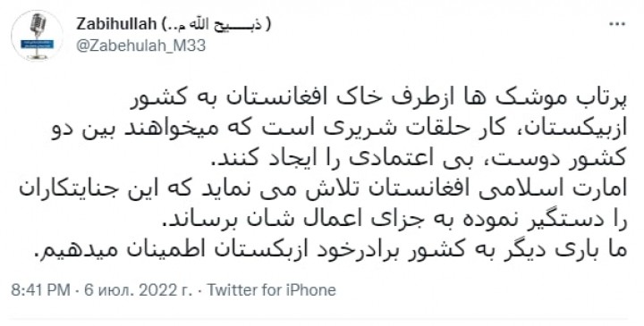 Официальный представитель временного правительства Афганистана Забиулла Муджахид сообщил, что исполнители ракетного обстрела узбекского Термеза с афганской территории ставили целью создать атмосферу недоверия между дружественными Узбекистаном и Афганистаном.