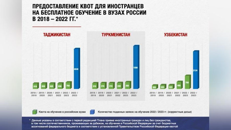 Отметим, что возможность получения высшего образования в российских вузах предоставляется и в других странах ближнего зарубежья. Так, в Таджикистане в этом году на 750 квотных мест подано 4530 заявок от абитуриентов страны. В Туркменистане на 250 квот претендует 1556 будущих студентов.