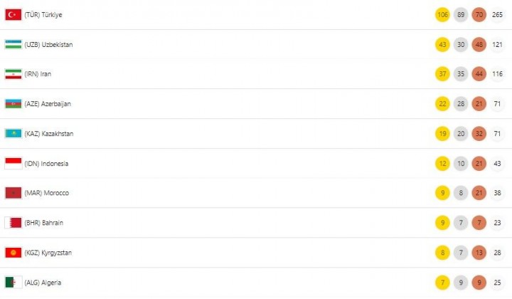 На первом месте идет страна-хозяйка Турция, которая с большим отрывом опережает другие страны - 106 золотых медалей, а сборная Ирана с 37 медалями идет на 3 месте, отмечает Olamsport.