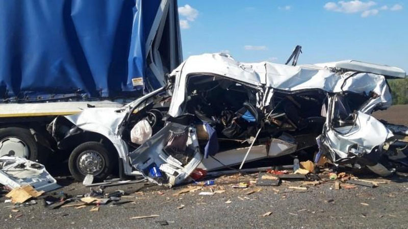 В Ульяновской области России фура наехала на микроавтобус, который оказался зажатым между двумя большегрузными автомобилями.